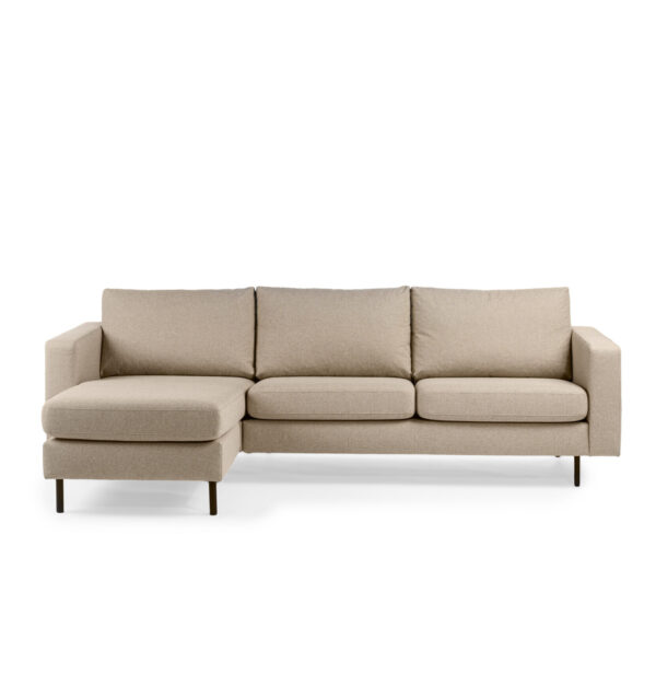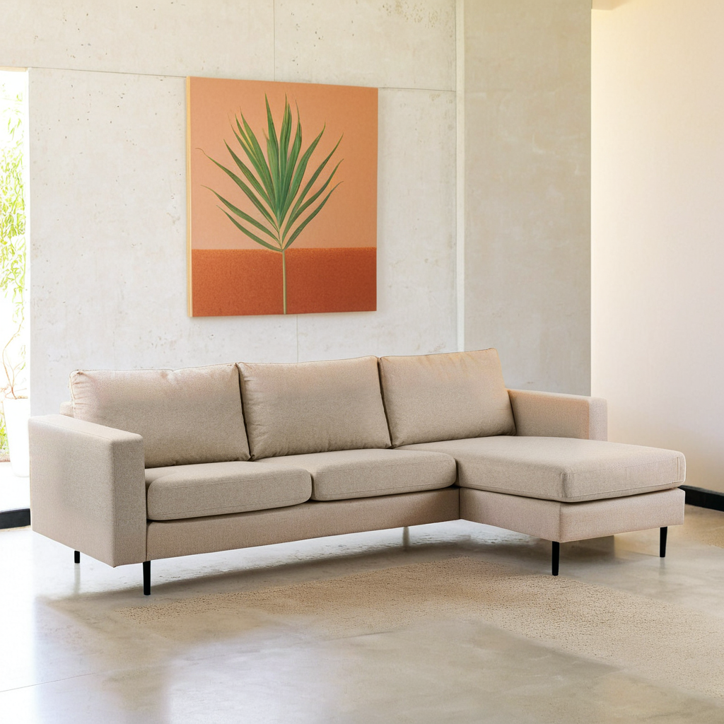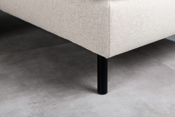 Ontdek de Hoekbank Exeter, bekleed met de hoogwaardige geweven stof Dillon en beschikbaar in de elegante kleuren beige en ivoor. Deze moderne bank heeft speelse zwarte ronde pootjes die een unieke en stijlvolle uitstraling geven.